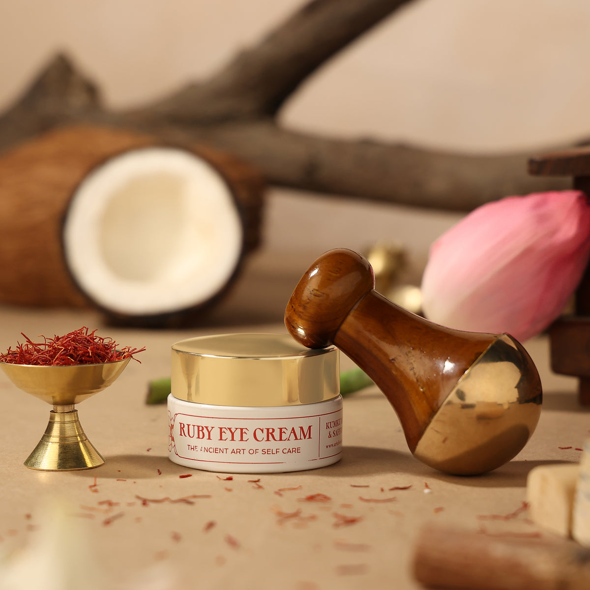 Aplica una pequeña cantidad de la Ruby Eye Cream alrededor de los ojos. Usando el Mini Kansa Wand, masajea suavemente con movimientos circulares, enfocándote en los puntos clave marma para estimular la circulación, reducir la hinchazón y fomentar la relajación. Esta técnica ayurvédica tradicional no solo nutre la piel sino que también equilibra los doshas para una apariencia fresca y juvenil.