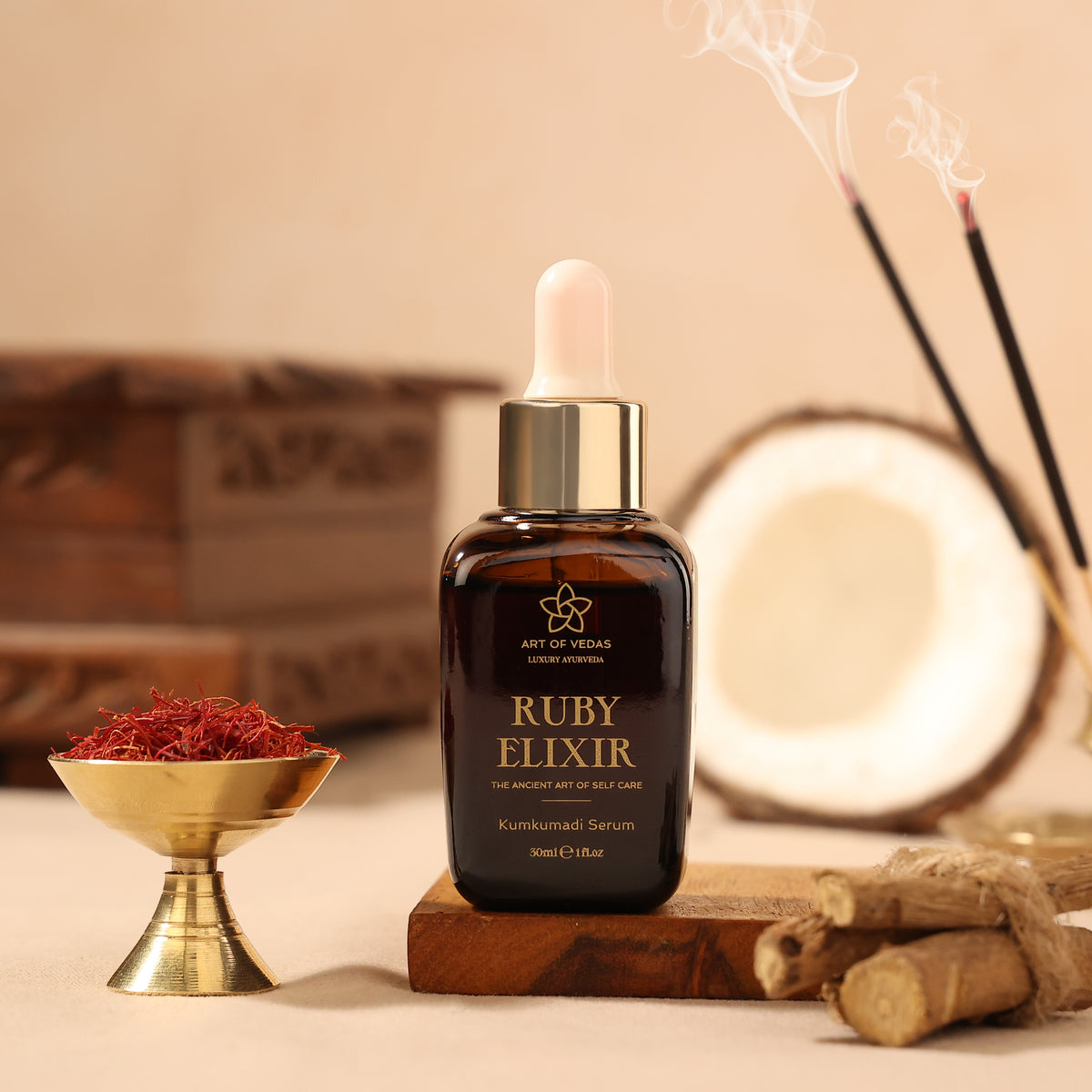 - Ruby Elixir Kumkumadi Serum (30ml): Ylellinen sekoitus sahramia ja ayurvedisiä yrttejä kirkkauden lisäämiseksi, ihon rakenteen parantamiseksi ja tasaisen sävyn edistämiseksi.