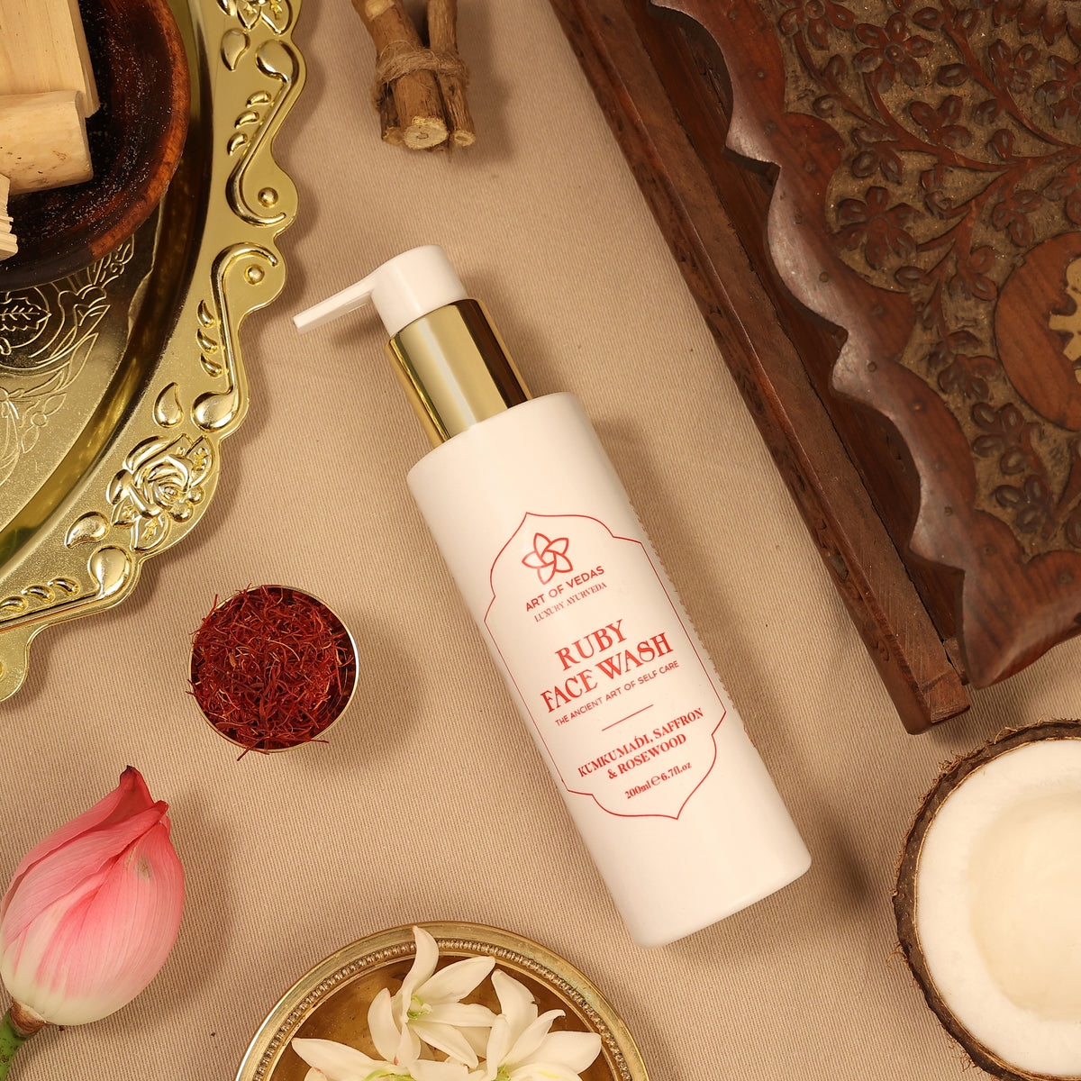 - Ruby Face Wash (150ml): Hellävarainen puhdistusaine, johon on lisätty Kumkumadia ja sahramia, puhdistamaan ihoa samalla kun se säilyttää luonnollisen kosteutensa ja hehkunsa.