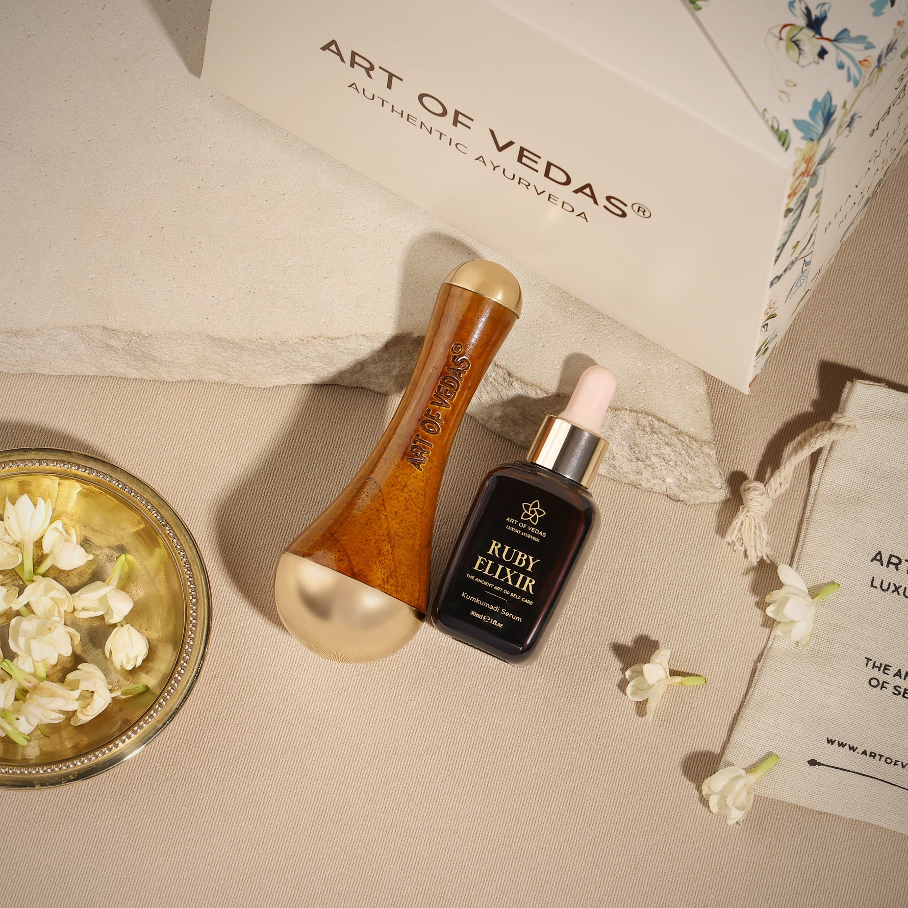 Aloita päivittäinen tai viikoittainen itsehoitorituaalisi levittämällä Kumkumadi Serum hellävaraisesti kasvoillesi ja kaulallesi. Käytä Kansa Wandia ja tee rytmikkäitä, pyöriviä liikkeitä kasvojesi marmapisteillä. Tämä perinteinen tekniikka ei ainoastaan ravitse ihoa syvästi, vaan myös harmonisoi doshat ja edistää rentoutumista.